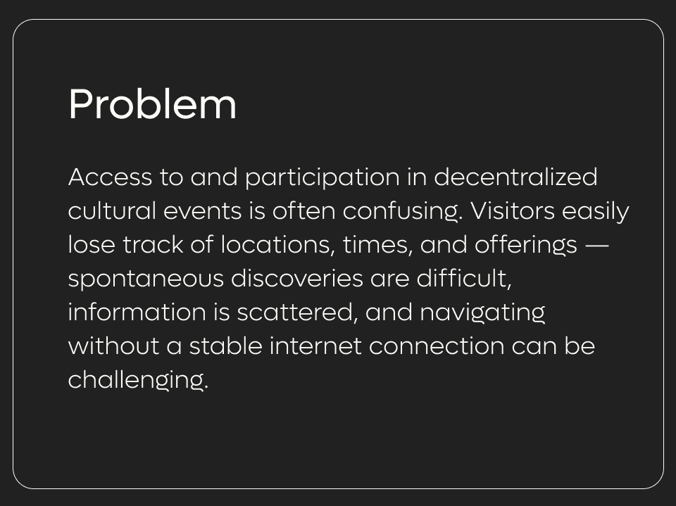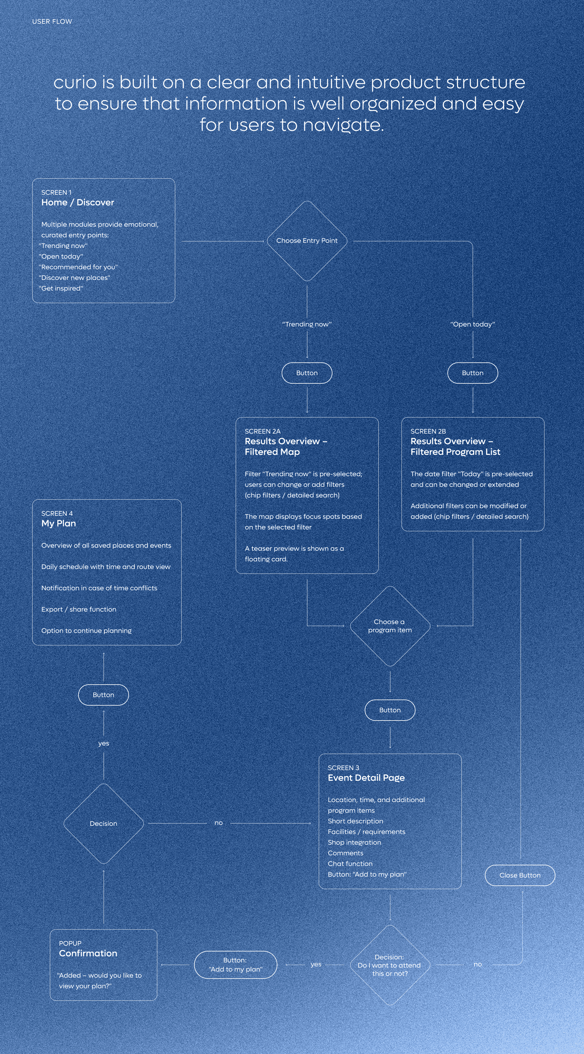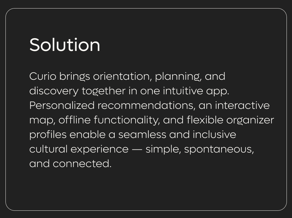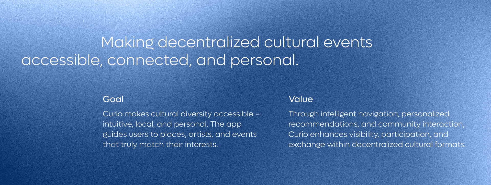 Curio is a digital platform designed to make decentralized cultural events more accessible, engaging, and inclusive. From local festivals to urban art walks, Curio helps users explore cultural diversity through intuitive navigation, personalized recommendations, and community interaction.