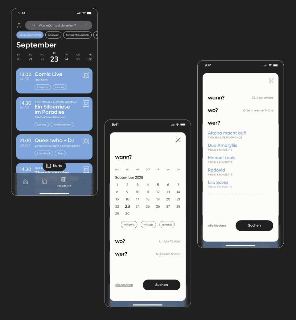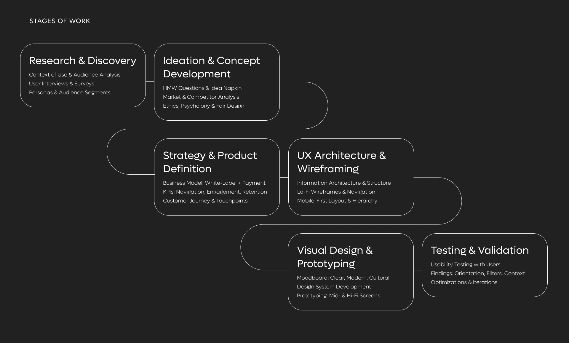 The project was developed over the course of a five-month UX/UI Design Bootcamp, covering the complete process from user research and problem framing to concept development, wireframing, visual design, prototyping, and usability testing.